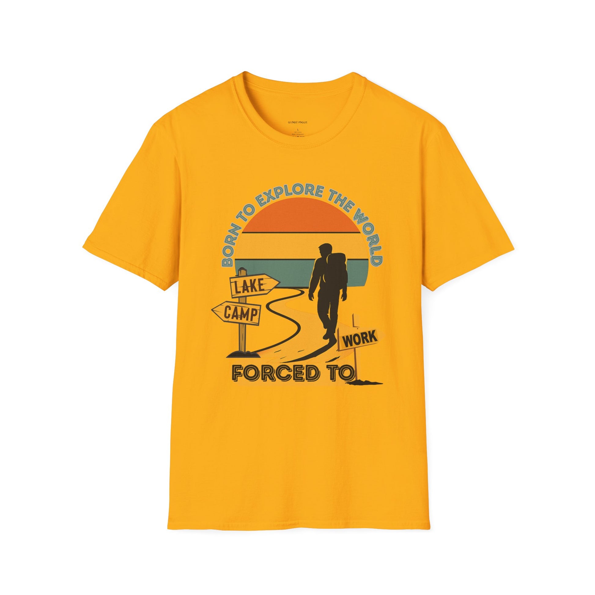 Adventure Unisex T-Shirt — “Born to Explore the World, Forced to Work” Retro Camping Tee