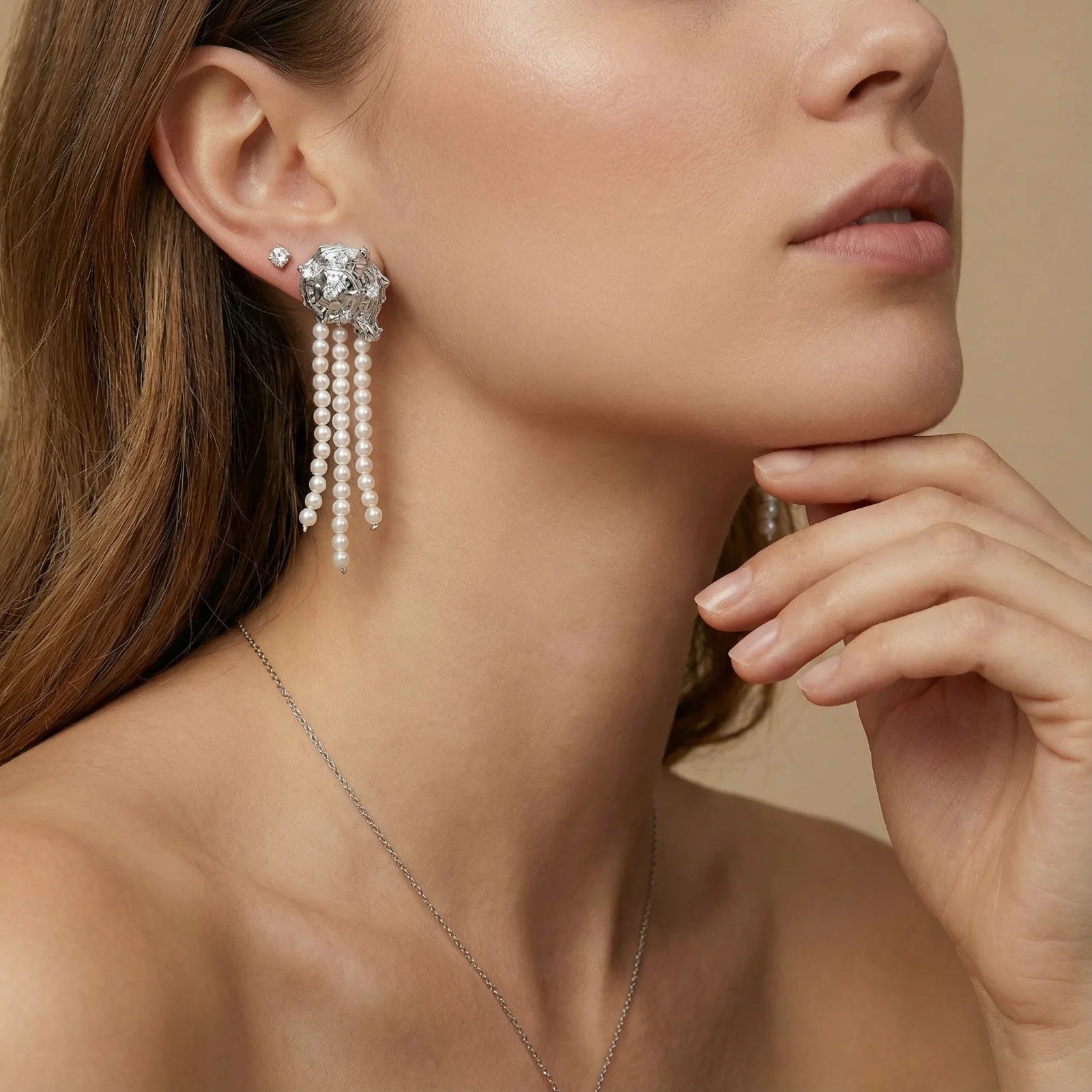 Sculpted panther heads with pavé zirconia—channeling fearless confidence—cascade into lustrous pearl drops for that untamed elegance.