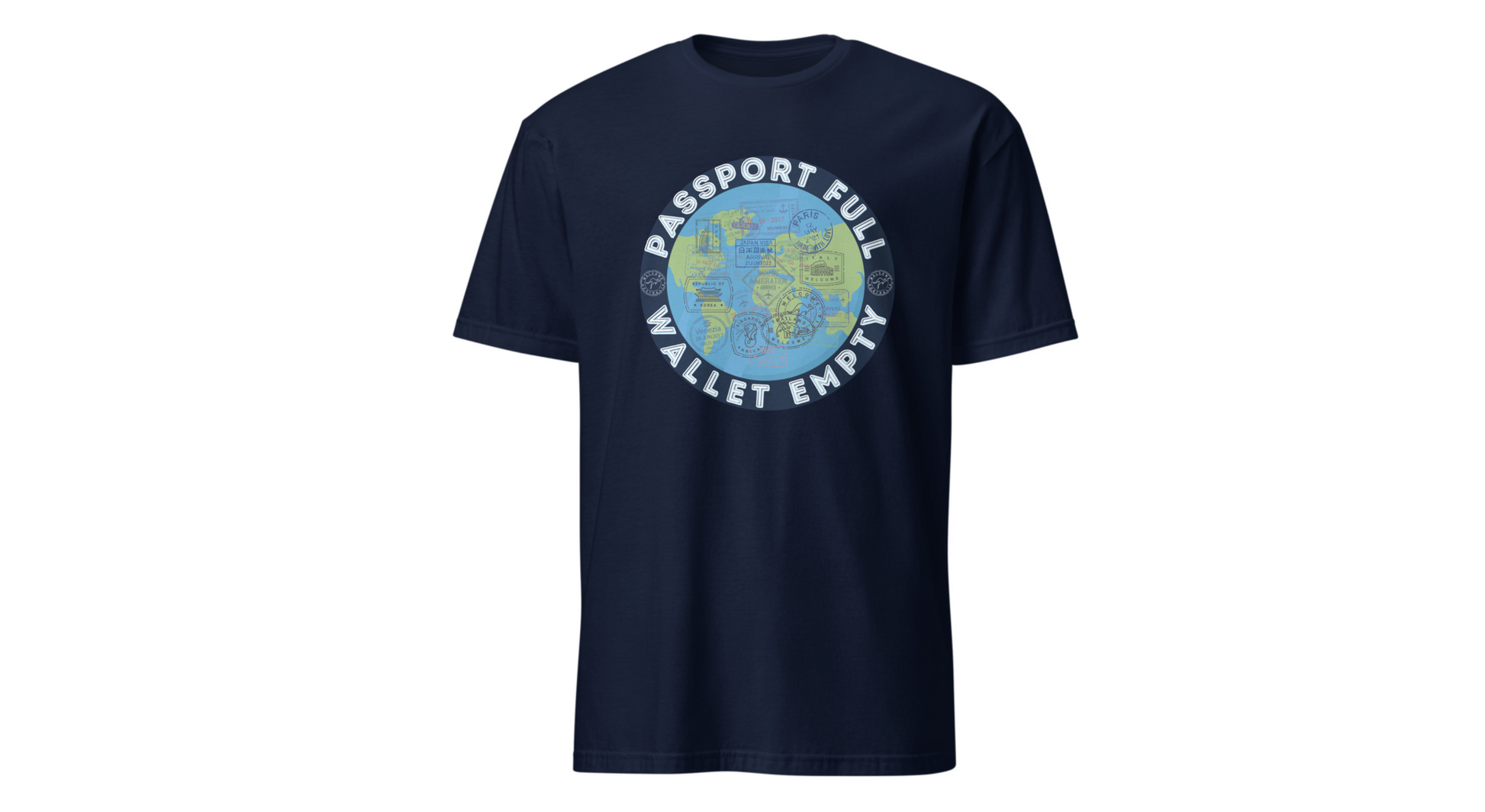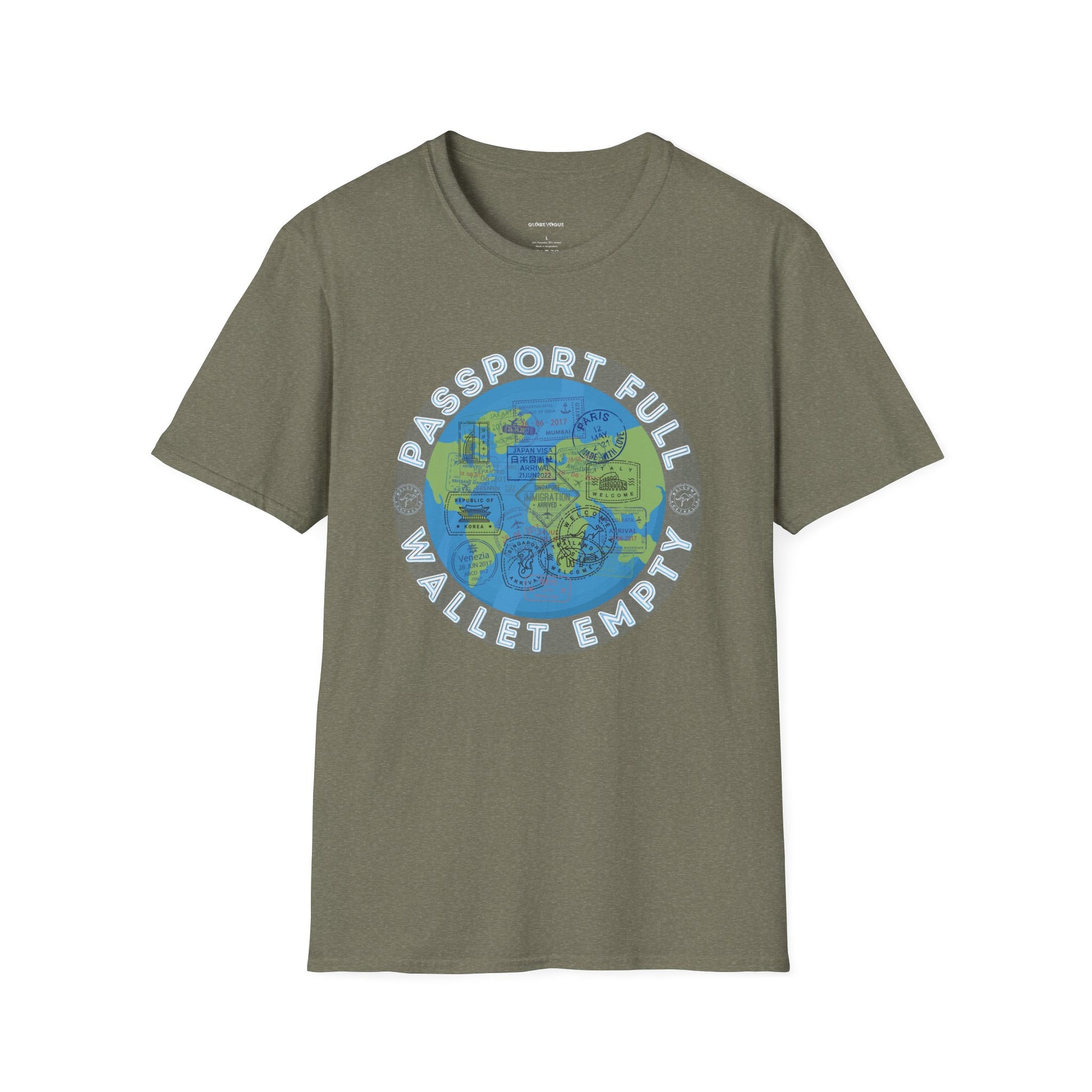 Travel Unisex T-Shirt — “Passport Full, Wallet Empty” with globe graphic, funny travel shirt.